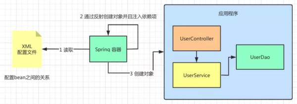 引入 IoC 以后,这个创建过程发生的反转,这些 UserController 和 UserService 之间的依赖关系由 XML 文件定义以后由 Spring 容器进行创建。