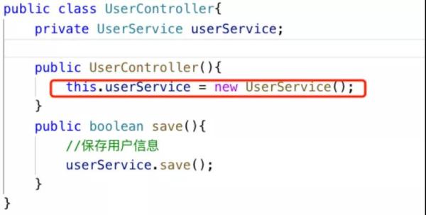如图 2 所示,假设在 UserController 中需要使用 UserService,就需要在其 UserController 构造函数中对 UserService 进行实例化。