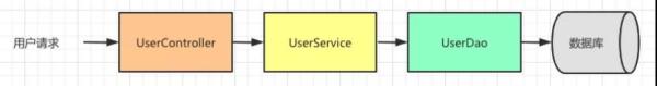 如图 1 所示,用户请求一个 UserController 获取 User 信息,UserController 会调用 UserService,在 UserService 中会处理关于 User 的业务逻辑。