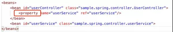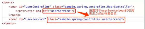 基于构造函数的 DI,在上面的例子中提到过这里进行一下回顾,如图 7 所示,在 XML 的配置文件中定义 UserController 的 bean 同时将 ref 指定 UserService,也就是需要注入的 bean。