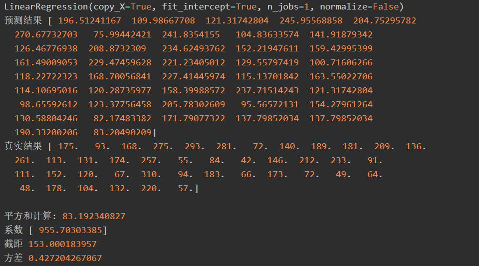 LinearRegression回归模型在Sklearn.linear_model子类下,主要是调用fit(x,y)函数来训练模型,其中x为数据的属性,y为所属类型。sklearn中引用回归模型的代码如下: