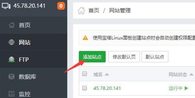 宝塔面板新建一个网站,点击下图中绿色的按钮新建一个站点