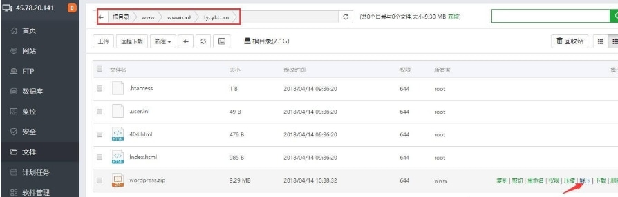 可以在wordpress.zip的看到右下角有一个箭头,鼠标指向就能看见,这里选择解压,直接确认即可,解压完成之后可以把zip的压缩包删除
