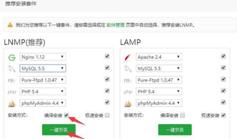 接下来就会看到一键安装环境的界面,一般我们会选择左侧的LNMP架构,编译安装