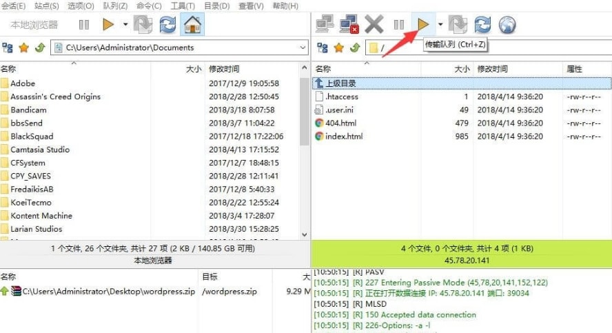 连接好FTP之后,我们把刚刚打包的wordpress压缩文件直接拖到右侧的文件栏里面,然后点击传输,上传到服务器