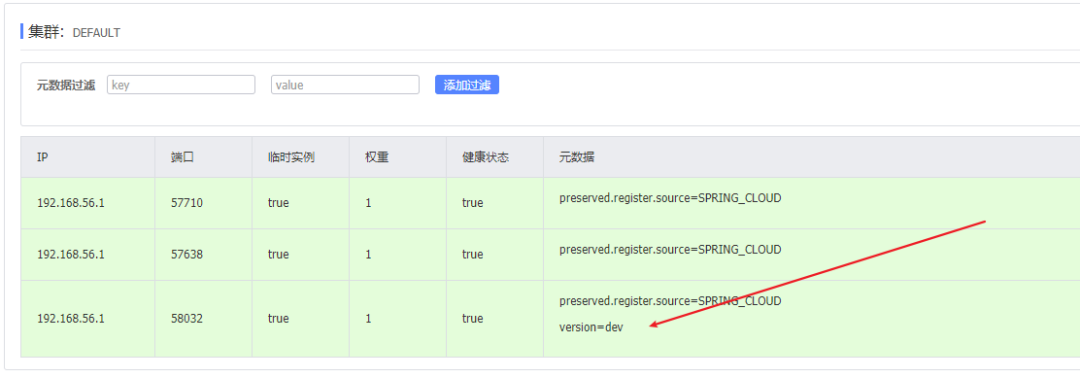 这里我们可以使用注册中心的元数据metadata来区分,可以通过spring.cloud.nacos.discovery.metadata.version = dev配置指定,也可以在nacos服务列表中直接添加元数据信息。