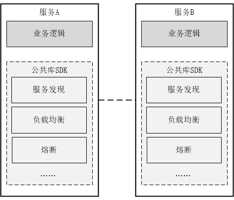 基于上面存在的问题,很容易会想到将基础设施功能设计为一个公共库 SDK,让服务的业务逻辑与这些功能降低耦合度,提高重复利用率,更重要的是开发者只需要关注公共库 SDK 的依赖及使用,而不必关注实现这些公共功能,从而更加专注于业务逻辑的开发,比如 Spring Cloud 框架是类似的方式。如下图所示: