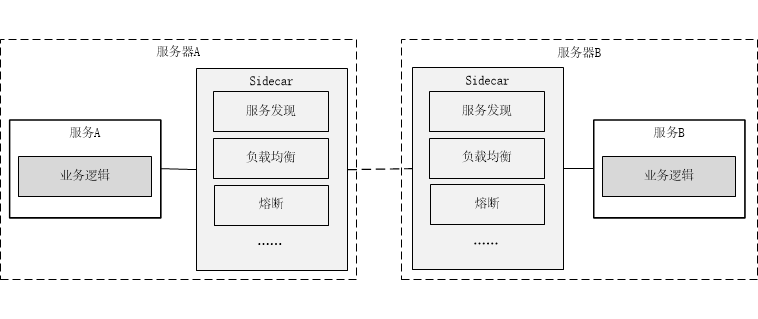 这就是典型的 Sidecar 代理模式,也被翻译为边车代理,它作为与其他服务通信的桥梁,为服务提供额外的网络特性,并与服务独立部署,对服务零侵入,更不会受限于服务的开发语言和技术栈,如下图所示。