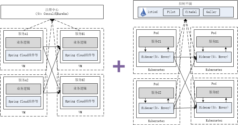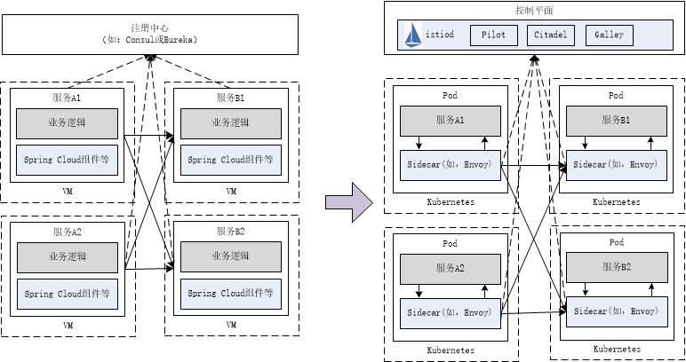 目前开源 Istio 已经成为 Service Mesh 事实上的标准,更是新一代微服务架构发展的趋势,因此公司希望尝试迁移到 Istio 框架,希望最终形成类似下图右边部分。