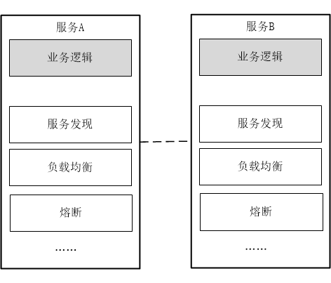 在微服务架构中,服务发现、熔断、治理等能力是微服务架构重要的组成部分。微服务化之后,服务更加的分散,复杂度变得更高,起初开发者将诸如熔断、超时等功能和业务代码封装在一起,使服务具备了网络控制能力,如下图所示。