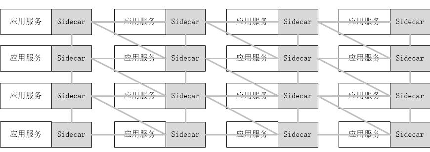 把 Sidecar 模式充分应用于一个庞大的微服务架构系统,为每个应用服务配套部署一个 Sidecar 代理,完成服务间复杂的通信,最终就会得到一个如下所示的网络拓扑结构,这就是 Service Mesh,又称之为“服务网格“。