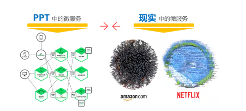 正如下图所示,PPT 中的微服务总是美好的,但现实中的微服务却是一团糟糕,想甩甩不掉,越看越糟心。难道就没有办法了么?