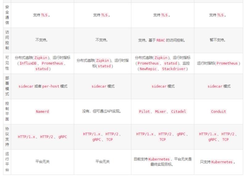 下面对针对目前市面上常见的 Service Mesh 框架进行的比较汇总,见下表所示: