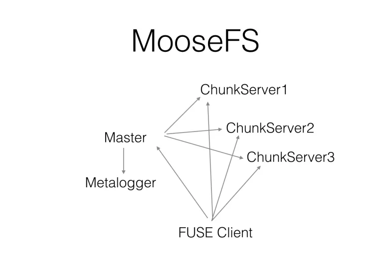 MooseFS 是来自波兰的开源分布式 POSIX 文件系统,也是参照了 GFS 的架构,实现了绝大部分 POSIX 语义和 API,通过一个非常成熟的 FUSE 客户端挂载后可以像本地文件系统一样访问。MooseFS 的架构如下图所示:
