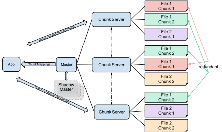 顾名思义,BigFiles/GFS 是为大文件优化设计的,并不适合平均文件大小在 1MB 以内的场景。GFS的架构入下图所示: