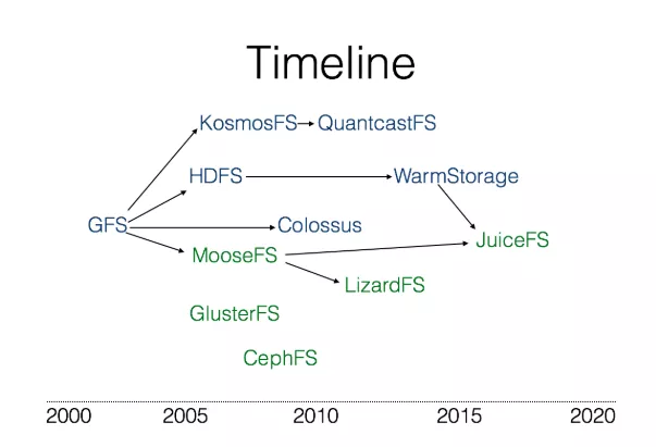 简要介绍了下我所了解的几个分布式文件系统的架构,把他们按照出现的时间顺序放在下面的图里(箭头表示后参考了前者或者是新一代版本):