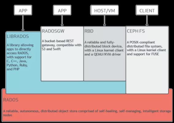 Ceph 是一个分层的架构,底层是一个基于 CRUSH(哈希)的分布式对象存储,上层提供对象存储(RADOSGW)、块存储(RDB)和文件系统(CephFS)三个API,如下图所示: