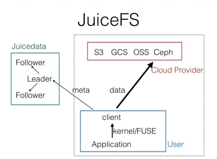 于是我们针对公有云,改进 HDFS 和 MooseFS 的架构,设计了 JuiceFS,架构如下图所示:
