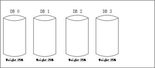 如下图所示:最开始我们为4个数据库分配了相同的权重,理论上落在每个库的数据概率均等。但是由于用户也有高频低频之分,可能某些库的数据增长会比较快。当挂载新的数据库节点后,我们灵活的调整了每个库的新权重。