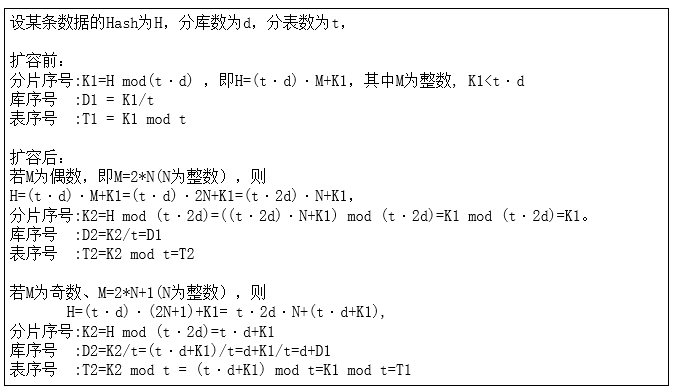 上述错误案例二中,整体思路完全正确,只是最后计算库序号和表序号的时候,使用了库数量作为影响表序号的因子,导致扩容时表序号偏移而无法进行。