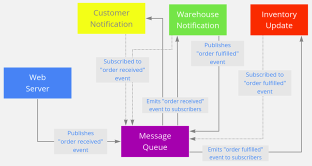 想象一个在线商店的微服务系统。一个微服务接受网站下的订单。另一个微服务向客户发送一条文本通知,告知其收到了他们的订单。另一个微服务通知仓库发出产品。最后,另一个微服务更新库存计数。