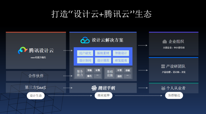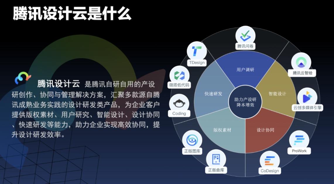 腾讯设计云是腾讯自研自用的产设研创作、协同与管理解决方案,汇聚多款源自腾讯成熟业务实践的设计研发类产品,如运用于调查分析的腾讯问卷、智能化设计生产平台腾讯云智绘、长短视频内容创作与协作平台云创多媒体引擎、一站式设计协作平台CoDesign、团队协同平台ProWork、拖拽式低代码开发平台微搭低代码和软件研发管理协作平台CODING等,以及正版图库直通车和正版曲库直通车两大版权素材库,为企业客户提供版权素材、用户研究、智能设计、设计协同、快速研发等能力,助力企业实现高效协同,提升设计研发效率。