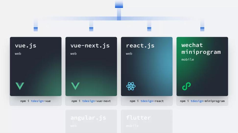 开发方面,TDesign支持多个端和主流技术栈,桌面端 Vue2 已发布 Beta 版本,桌面端 Vue3、React 和移动端 Vue3 、微信小程序已经发布了 Alpha 内测版本,Augular、Flutter 等其他技术栈组件也正在开发中。