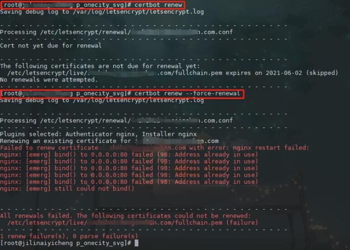 我这里由于nginx没有关闭所以80端口还在占用所以就不演示了,更新证书一定要先停止nginx