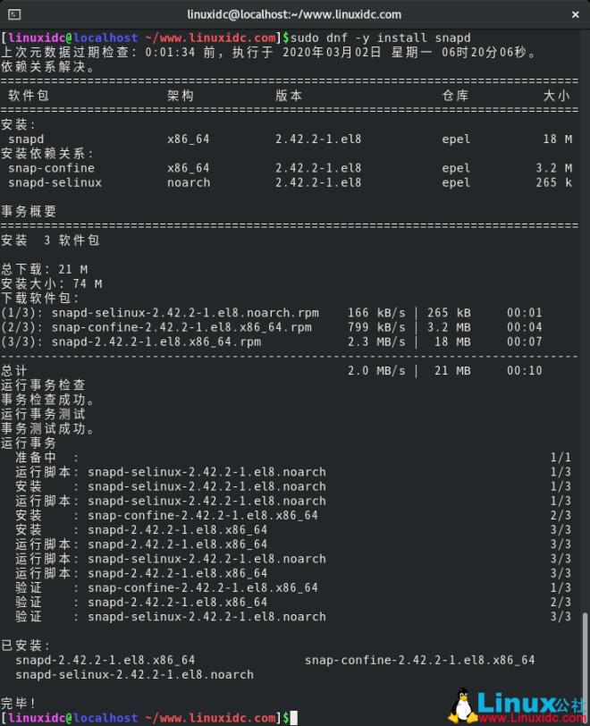 [linuxidc@localhost ~/www.linuxidc.com]$sudo dnf -y install snapd