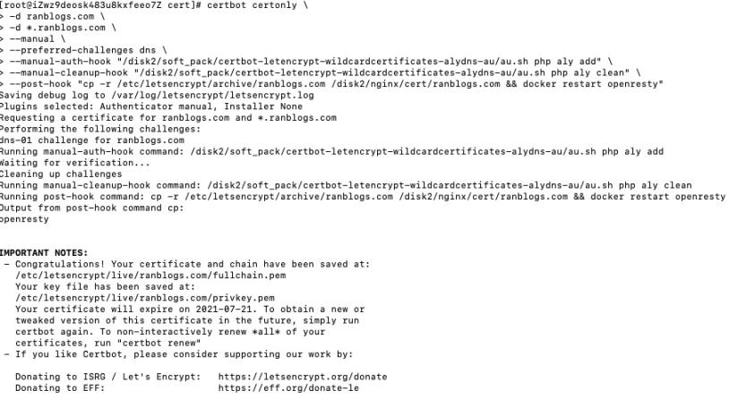 --post-hook "cp -r /etc/letsencrypt/archive/ranblogs.com /disk2/nginx/cert/ranblogs.com && docker restart openresty"