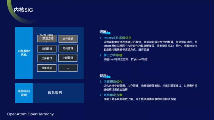 内核共建的方向比较多,体系架构有各个硬件平台的移植,内核模块中功耗管理、时间管理、任务调度、中断管理、文件系统、三方库相关的内核 shell 命令移植,目前深开鸿主要在文件系统和第三方库方面做社区共建。深开鸿希望将来展开更多方向的优化工作,并向外提供具体场景下内核系统移植方案。