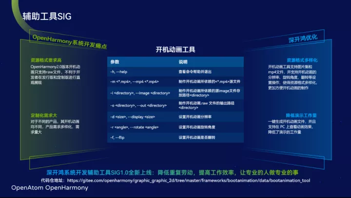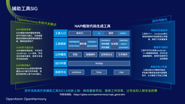 成立辅助工具 SIG 组的宗旨是 “降低重复劳动,提高工作效率,让专业的人做专业的事”。 NAPI 框架代码生成工具、IDL 转换工具和开机动画工具都是围绕着这个宗旨开发而成的。