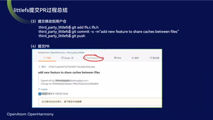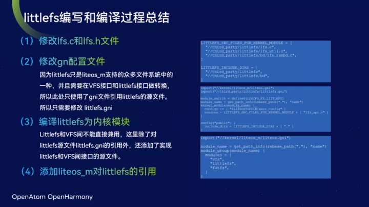 针对 littlefs 文件系统优化过程中修改涉及的相关文件,包括 littlefs 文件代码,也就是点 c 和点 h 文件;也有编译相关的文件,即.gn 文件 gni 文件,之所以修改编译相关的文件是为了测试 littlefs 的优化后的代码,我们团队增加了相关的测试用例,这些测试用例会调用内核文件系统的 API,涉及到这些编译相关的文件。