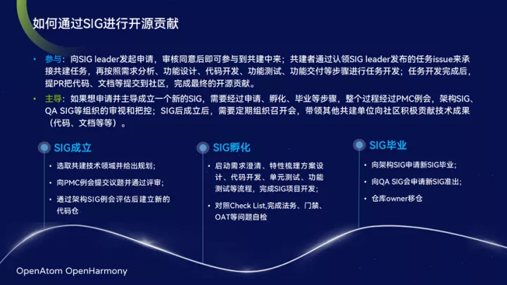 启动需求澄清、特性梳理方案设计、代码开发、单元测试、功能测试等流程,完成 SIG 项目开发 → 对照 Check List,完成法务、门禁、OAT 等问题自检。