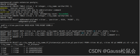 INSERT INTO cities (id, position, city_name) VALUES (3,ST_GeomFromText('POINT(20.8 30.3)',4326), 'CityC');示例 3:计算三个城市间任意两个城市距离。