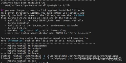omm 用户执行下面的语句,完成 PostGIS 相关动态链接库在数据库实例节点中的分发。因为我的 openGauss 是单机极简版,所以使用 cp 复制到节点路径。如果是企业版需要使用 tranfer.py,具体参考 openGauss 产品文档 PostGIS 安装章节。
