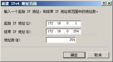 3.6、在“起始IP地址”里输入“172.16.0.1”,“结束IP地址”里输入“172.16.0.254”点击“确定”