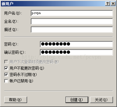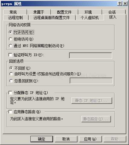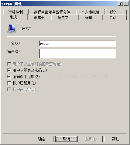 4.3、双击新增加的用户“pcvpn”弹出“属性”窗口
