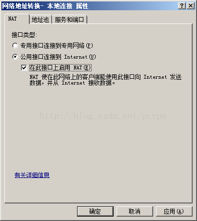 3.3、在这里选择“公用接口连接到Internet”-“在此接口上启用NAT”,点击确定。