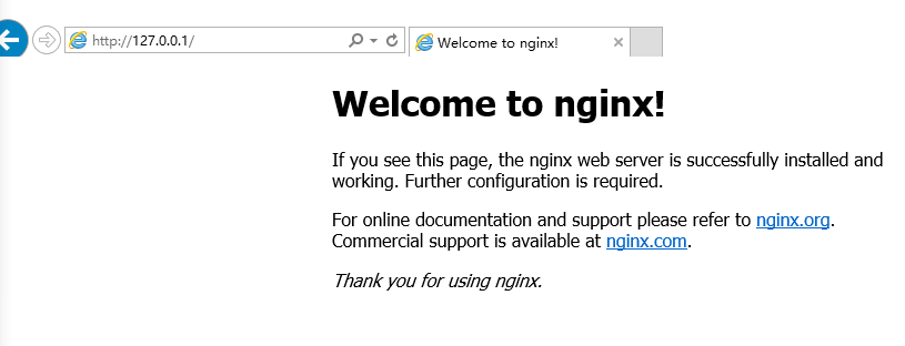 在浏览器地址栏输入:127.0.0.1,会看到如下图所示的nginx欢迎界面