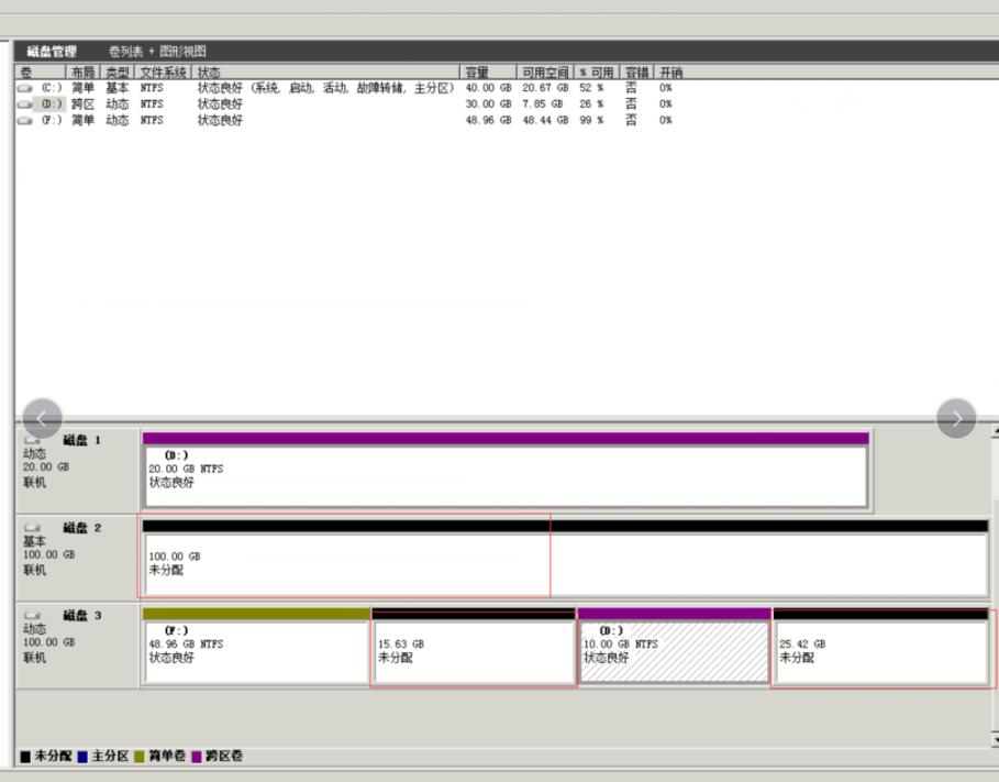 9月3日,在阿里云服务器上进行了50g的磁盘扩容,然后对磁盘2新扩容的50G进行了操作扩展卷,发现E盘变成了141G,不对啊,我想给F盘扩容的,然后就做了一个让我后悔的操作,对着那个小方块点了一下删除卷,弹出的确定框本能的就点击了确定,然后就变成下图所示了。E盘整个没了