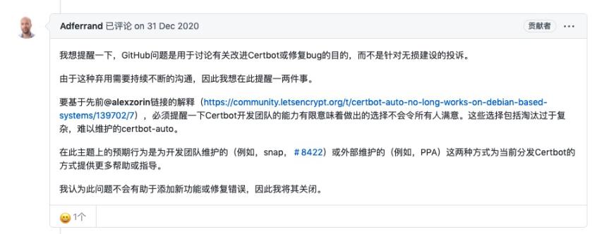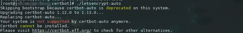 前言 certbot-auto申请证书时发现如下提示;certbot-auto被弃用了 Skipping bootstrap because certbot-auto is deprecated on this system. Your system is not supported by certbot-auto anymore. Certbot cannot be installed. Please visit https://certbot.eff.org/ to check for other alternatives. 根据github的issue看到作者的回应(原回复是英文, 我机翻了一下截图出来) github的issue: https://github.com/certbot/cert