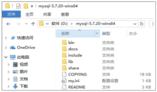 配置免安装版 MySQL 的具体操作步骤如下: 步骤 1):将 MySQL 免安装压缩文件解压到一个文件夹,如 D:\mysql-5.7.20-winx64\,如图所示。 步骤 2):配置环境变量,在系统变量 path 后面追加 D:\mysql-5.7.20-winx64\bin,如图所示。 步骤 3):创建配置文件,命名为 my.ini,编辑 my.ini 文件的内容,如图所示。 basedir = D:\mysql-5.7.20-winx64\ datadir = D:\mysql-5.7.20-winx64\data port =3306