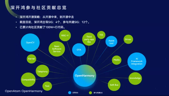 截至 2022 年 11 月,深开鸿共计参与共建 OpenAtom OpenHarmony(以下简称 OpenHarmony)社区 16 个 SIG,其中 4 个为深开鸿主导,并累计贡献代码量超过百万行。