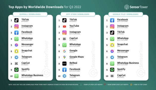 其中 TikTok 下载量再次霸榜(非游戏类应用),其在两大移动平台上的总安装量为 1.965 亿次。但若只看 Google Play,则是 Facebook 以 1.503 亿次跃居第一(取代了之前的 Instagram)。