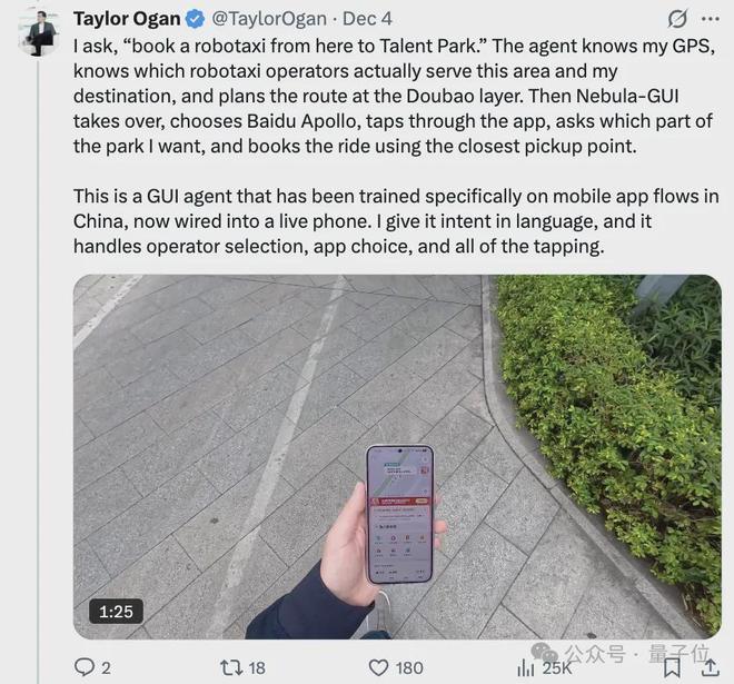 他还展示了告诉豆包手机助手从其当前所在位置打辆无人车去某公园,只见它会获取其GPS位置,知道哪些无人车运营商覆盖其所在区域和目的地,并完成路线规划,接着打开打车软件逐步点击应用界面,询问其具体要去公园的哪个位置,并根据最近的上车点完成叫车。