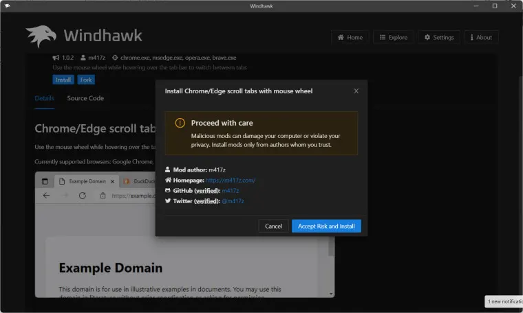 访问: 戴森11·11官网特惠季活动大厅在 Windows 上安装 Windhawk 后,用户将在主屏幕上看到模组建议。选择一个模组后,用户只需要点击安装按钮即可获取。用户需要在接受安装模块或拒绝安装模块之间进行选择时,将出现一个号召性用语。带有鼠标滚轮的 Chrome/Edge... 全文