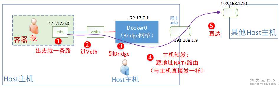 Docker容器里面,网络很简单,就一个eth0。所以你往外发报文,都是经过eth0网卡。而这个网卡是一个veth网线的一头,所以这个报文就会到达Bridge网桥(即docker0)。而这个网桥就是Host主机的一个网卡,所以就到达了目的地。