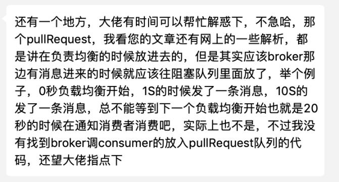 很显然他的项目是用了 push 模式进行消息拉取,要回答这个问题,就要从 RockeMQ 的消息拉取说起: