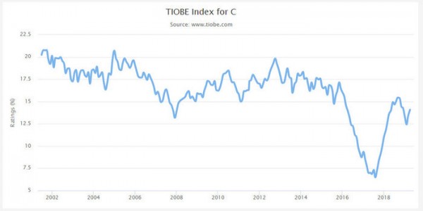 C/C++ 上升至第五名,PHP 下降至第六名;上期 Perl 排名第20名,在本期未能保持,被 Ada 取代。